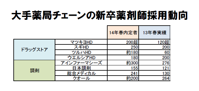 マツモトキヨシHDは調剤併設した店舗の出店を拡大し、13年度は20店、14年度30店と毎年5割増のペースで出店数を増やす計画だ。14年春に約200人を採用するのに続き、15年春には5割増の300人の確保を目指す。