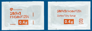通常、2歳以上7歳未満の小児には1回0.2g(セチリジン塩酸塩として2.5mg)を1日2回、朝食後及び就寝前に用時溶解して経口投与する。 通常、7歳以上15歳未満の小児には1回0.4g(セチリジン塩酸塩として5mg)を1日2回、朝食後及び就寝前に用時溶解して経口投与する。