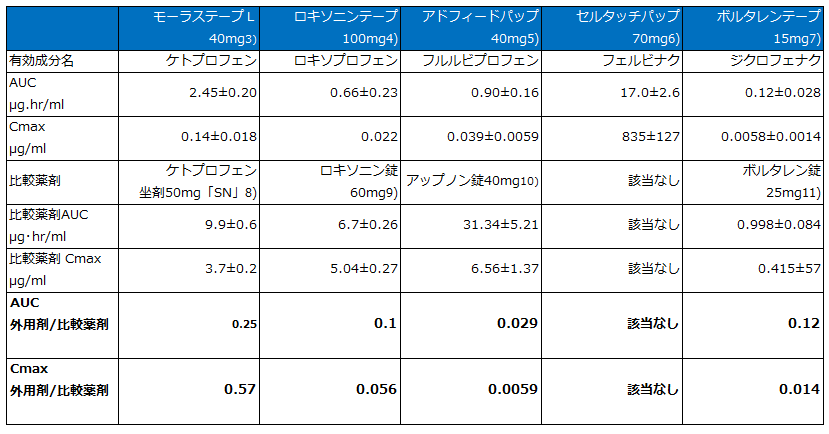 アップノン錠はほとんど使用されていないと思いますので実際に現場で使えそうな数値はロキソニンテープとボルタレンテープぐらいでした。