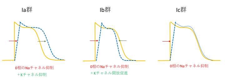 0相でのNa+の細胞内への流入を抑えることで、活動電位の立ち上がりを遅らせる。