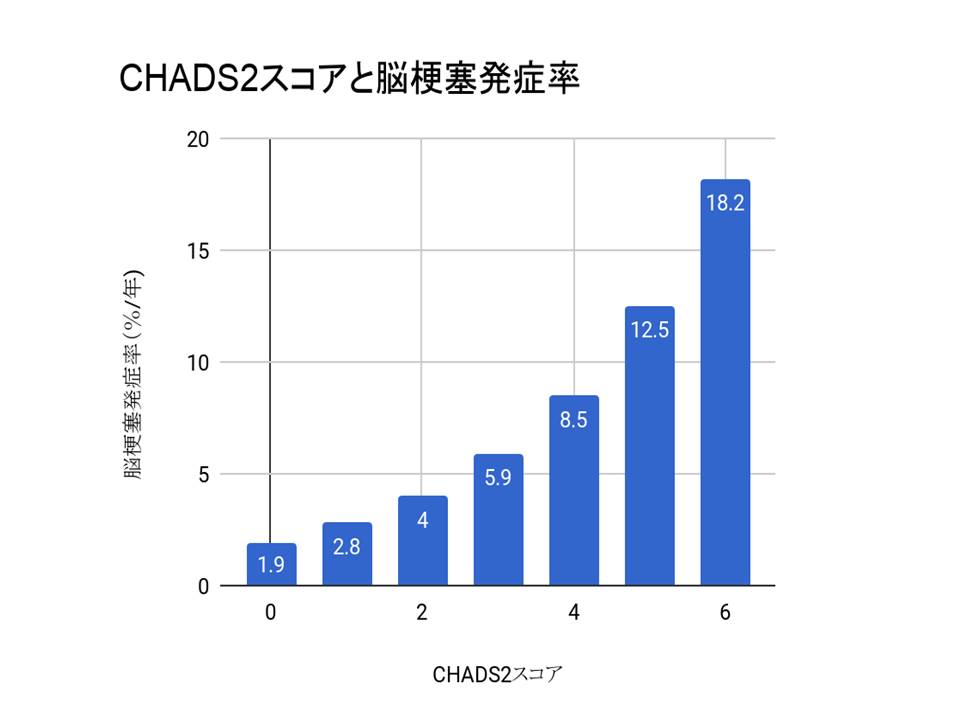 CHADS2スコアとは非弁膜症性心房細動を持つ方が1年以内に脳梗塞を起こすリスクを簡易に予想できるようにしたものです。