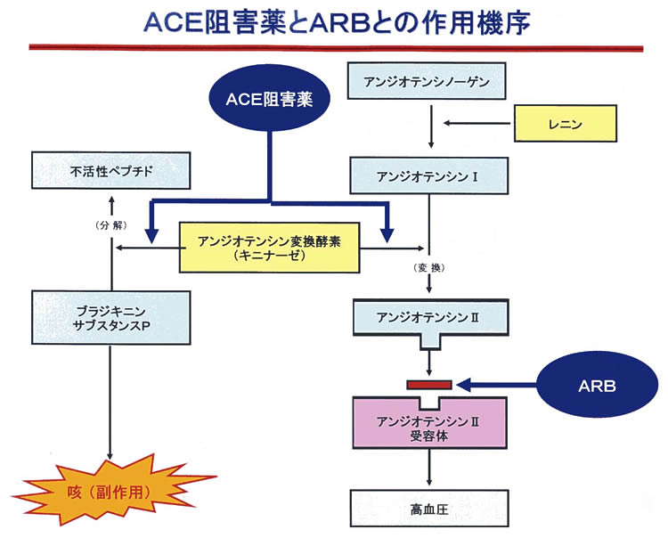 ・アンジオテンシン変換酵素はキニナーゼ。なのでACE-iでこの酵素を阻害するとブラジキニンが増え、キニンレベルが増える。これはARBではみられず。このことが咳の原因となる。ブラジキニンは血管拡張その他ARBにはない作用がある