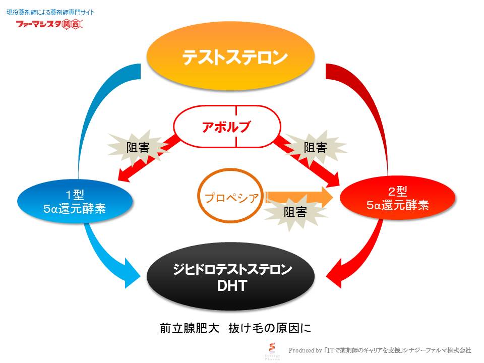 そう思い込んでいる薬剤師さんは、この時点で 「皮膚科!?(・_・;? Σ(゚д゚lll)」 となってしまうのではないでしょうか。 アボルブ(成分名:デュタステリド)の薬理作用は、5α還元酵素阻害です。 この薬理作用を聞いて、他に思いつく薬剤はありませんでしょうか?