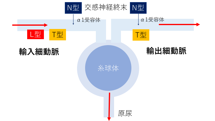 糸球体の入り口である輸入細動脈にはL型、T型、N型のCaチャネルが、出て行く側の輸出細動脈にはN型、T型のCaチャネルが存在し、細動脈の収縮に関わっています。