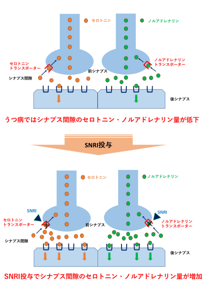 SNRIはシナプス間隙のセロトニン、ノルアドレナリン量を増やすことで、うつ症状や意欲の低下を改善します。