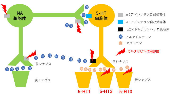 ミルタザピンは5-HT2A/2c及び5-HT3受容体を遮断することで、抗不安作用や抗うつ作用を示す5-HT1受容体にセロトニンを特異的に結合させることから、性機能障害や消化器障害の副作用の頻度がSSRIやSNRIに比べて低いのです。