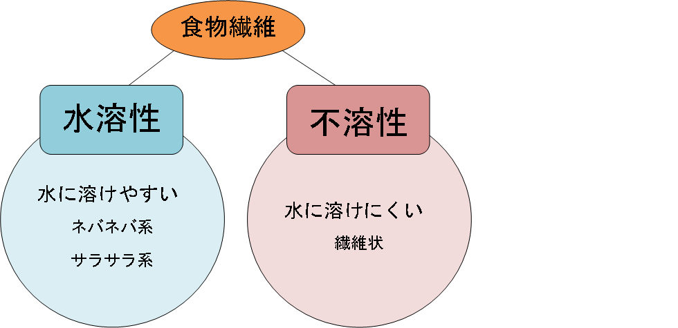 このように食物繊維は水溶性と不溶性の2種類に分けることができます。