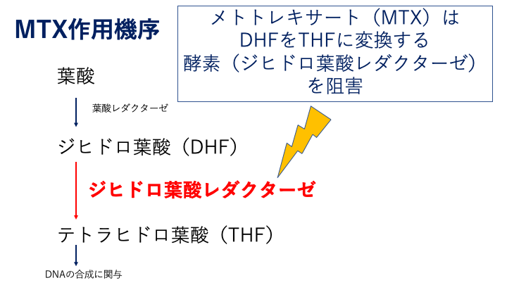 メトトレキサートは葉酸の代謝過程でジヒドロ葉酸(DHF)からテトラヒドロ葉酸(THF)に変換するジヒドロ葉酸レダクターゼを阻害することで、葉酸が活性型になるのを抑え、葉酸の働きを抑えます。