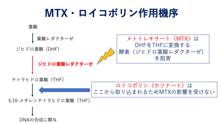 メトトレキサートは葉酸拮抗薬で、葉酸が活性型になる過程(ジヒドロ葉酸→テトラヒドロ葉酸)を阻害します。