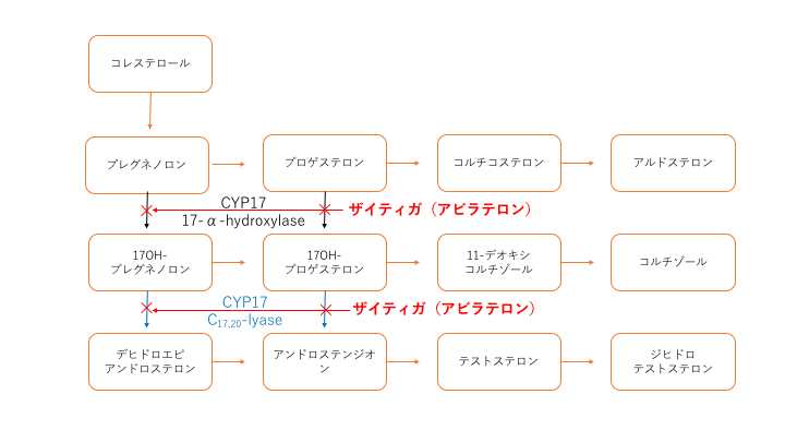 ザイティガ(アビラテロン)はアンドロゲンの合成に関与するCYP17を阻害しアンドロゲンの生合成を抑えます。