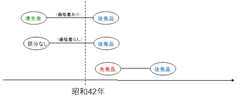 しかし、のち(昭和42年より後)に後発品が上市し、かつ価格差があった場合、元の昭和42年以前の医薬品は、状況的には、先発品に相当するという考えから、「準先発品」という分類になりました。