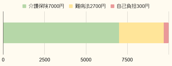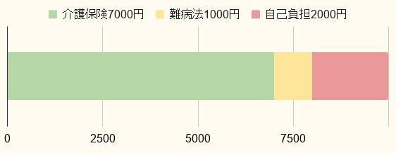 介護サービスの総額が10,000円の場合、介護保険3割の自己負担、難病法2割の自己負担のため請求は介護保険に7割、難病法公費に1割、残りの2割が自己負担です。