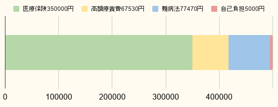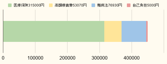 難病公費分に関しては上記と同様に計算をして医療保険315000円、高額療養費53070円、難病法76930円、自己負担5000円。