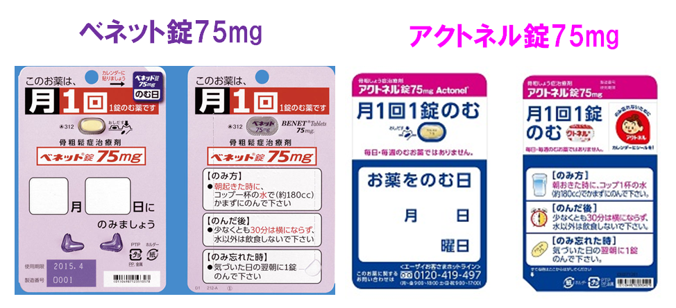 骨粗鬆症治療薬のアクトネル錠75mg(エーザイ)、ベネット錠75mg(武田)は2014年3月1日より長期投与解禁となる。「1カ月1回1錠まで」が解除となる。
