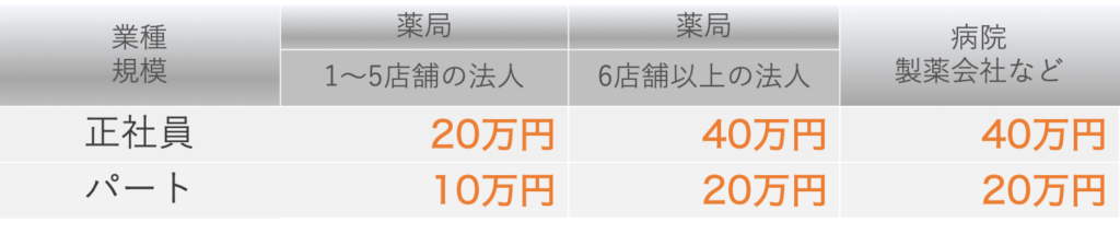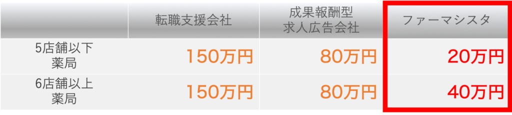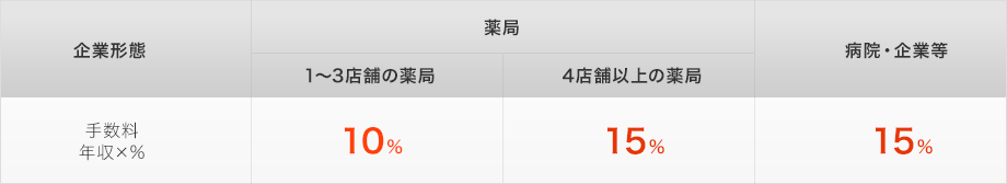 採用決定時に下記のように薬局の規模に応じて年収×10〜15%の手数料が発生。